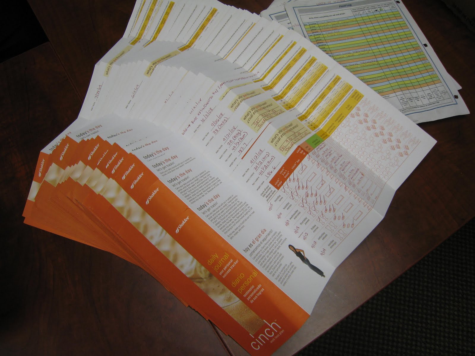 You probably have heard why journaling is so good for you for a variety of reasons. It’s therapeutic to work out your emotions, helpful for interpreting dreams, & essential for any weight loss program. Keeping a food log & progress chart is not just handy, it keeps us all accountable. Shaklee makes a Cinch Daily Journal that records a week worth of activity. We also have a standard copy of a food log & progress chart each that you can request from us, but many versions can be found online to download. Any diary or notebook would work too! (When my sister, Amanda, lost 65 lbs. with Cinch in 2008, she said the most important thing was the diligent journaling she did. Just look at that stack (below) of her records she keeps to remind her of her journey!)