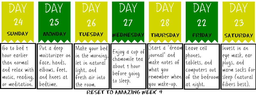 (Click to enlarge.) It’s Week 4 (again) of our Team RLEI Reset Program to Live Amazing. We are breaking it down into 7 steps in 7 days every week to help you reset with your wellness goals. Follow along and transform your health! The 4th week is focused on Sleep. Getting an adequate amount of sleep everyday is vital at a cellular level, way more than it gets credit for. For details, please reference: http://teamrlei.blogspot.com/2016/01/reset-to-amazing-you-cant-dream-if-you.html Keep journaling and tracking your daily steps, your calories, and working on a sustainable workout schedule. Just be sure to schedule in 7-9 hours of sleep too!